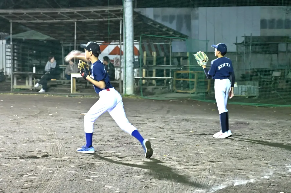 早くから硬式球に慣れ、中学野球で活躍できるように、中学生と合同で練習します。